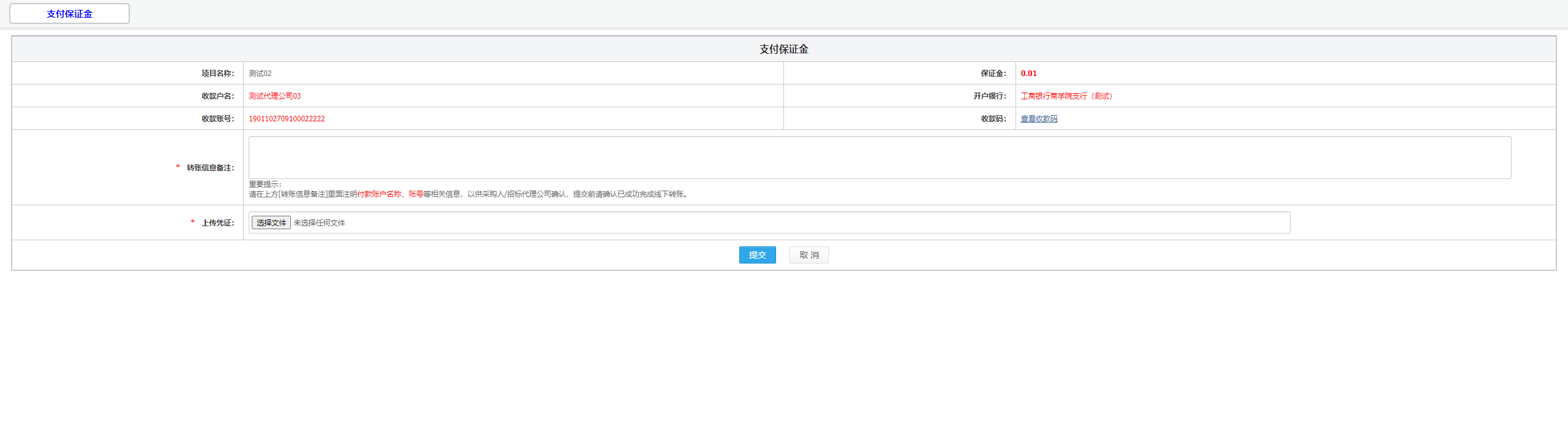 (三)在支付保证金页面,可查看代理公司的收款户名、开户银行、收款账号及收款码,您可选择线下支付或扫码支付。支付完成后,请填写转账信息并上传转账凭证(含银行转账记录或支付截图);代理公司收到申请并确认后,该笔支付即完成。支付成功后,您可正常参与项目的投标报价。(请注意,平台仅向用户提供系统软件使用权,不负责审核项目真实性,亦不收取任何标书费或保证金。请您在付款前务必确认项目真实性及付款信息。)